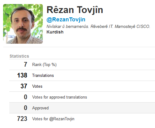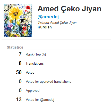 Li gor vî wêneyî min tenê 10-12 gotin wernegerandine. Çima? Ji ber ku di Twitterê de kes ne “werger” e. Koma wergeran tune. Kî bixwaze dikare wergerîne. Ne ez werger im, ne jî tu kes. Kesê ku rozeta wergerê ji Twitterê nestandibe jî û kesê standibe jî bi qasî hev in. Di kurdî de hîn kesî ew rozet jî nestandiye.